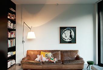 A 50-year-old leather sofa by mid-century Swedish designer Arne Norell adds color and warmth to the black and white tones in this New Zealand home. It also blends well with the vintage Mies van der Rohe Barcelona chair and Artemide lamp.