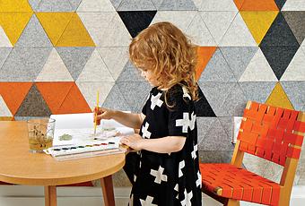 Chris Grimley and Kelly Smith transformed this cramped Boston apartment into a family-friendly home. The room shared by Mae, three, and her little brother Roen, one, features a custom prototype mural by FilzFelt, their mother’s textile design company. The carpet is by Flor, and the child-size chair and Amoeba table are both by Jens Risom for Knoll.