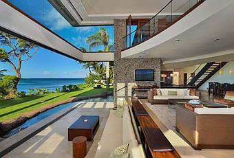 An enormous Maui home boasts 275 uninterrupted feet of oceanfront views. The mixture of wood paneling and stone columns helps it maintain harmony with its natural surroundings.