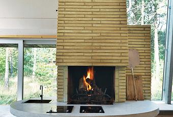 Inside a summer house in coastal Denmark, life revolves around the brick chimney, which the architect surrounded with a concrete counter that wraps from the kitchen to the living area. The stools are vintage. Photo by Karina Tengberg.