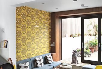 In her renovated London Terrace House, textile designer Orla Kiely opted to cover a wall in her mustard-yellow Rhododendron wallpaper. Photo by: Chris Tubbs