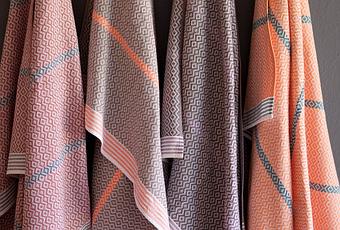 Mungo's flat-weave towels, made on antique looms in Plettenberg Bay, have traditionally reflected a strong British influence. But they've taken a detour with their new diamond weave towels in colorways like mulberry with partridge brown, hot orange, and forest green. While the pattern has an echo of traditional shweshwe fabric from the Eastern Cape, the contrasting stripe is more typical of Basutu blankets. Made of 100% cotton from Swaziland.