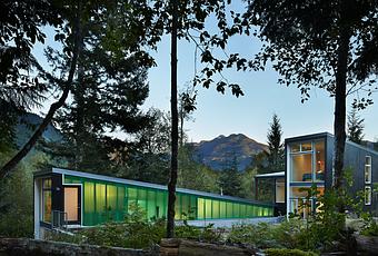 When the owners of this home first broke ground in 2009, they envisioned a place to retreat into the wild. The land is tucked away in Marblemount, Washington, about a two-hour drive from Seattle, and overlooks a lush canopy that stretches to the Cascade Mountains. For years, nothing obstructed the view but a frame that one owner, a cabinetmaker, had built with others. But eventually, in 2014, architect David Coleman completed the long-awaited property. “I wanted to claim a small piece of the wild site, rather than create a sprawling complex,” he said. His namesake architecture firm created a joint 890-square-foot cabin and 1,000-square-foot studio where an abundance of windows and a series of open spaces maximize the natural setting.