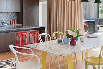 In this Australian home, classic Tom Dixon pendant lamps contrast with a bright dining table setup made up of a dining table by Chris Connell and painted Thonet chairs.