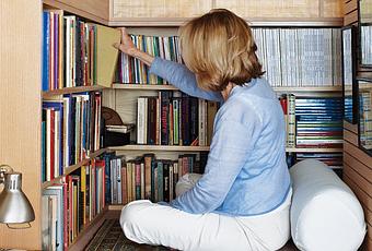 With no living room in this 240-square-foot Manhattan apartment, architect Tim Seggerman designed a built-in bookshelf and lounge area. Photo by David Engelhardt.