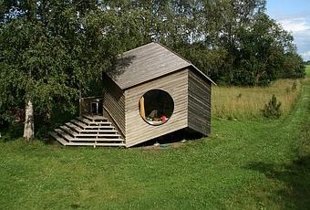 This summer cottage in the Virumaa region of Estonia rests on three feet, so it doesn't require a foundation, while the unique shape of the dwelling creates a very open interior.