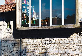Architect Matali Crasset converted a centuries-old farmhouse in the French countryside into a sleek modern home. The second-floor office is housed inside a rectangular concrete addition that Crasset inserted on top of the old farmhouse.