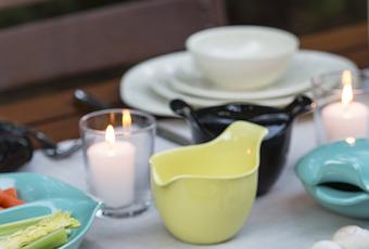 Industrial designer Russel Wright believed that the table was the center of the home. His Residential Collection, including this full place setting, is made from durable, shatterproof melamine. This setting includes a small bowl and side plate, salad plate, and dinner plate.