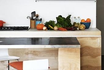 The kitchen of a house in L.A. has open storage and cabinets and an island made of plywood. Priced out of the modern market and stuck with a fixer-upper that seemed unfixable, a young L.A. lawyer took matters into his own hands—and found a new career in the process.