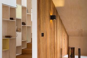 Rather than wasting space with one, long space, this compact modern home in Melbourne, Australia, was designed with a seating area, storage, and stairwell incorporated into the hall. Photo by Andrew Wuttke.