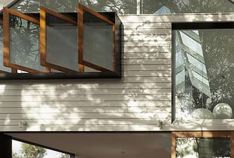 The rear of a renovated home in Sydney, Australia, designed by Christopher Polly, features a variety of windows that allow light and air to enter the house. Breezway Altair louvers, Viridian Comfort Plus low-e glass, and Western Red Cedar–framed sliding glass doors on the ground floor—plus pivot stay windows on the second story—allow residents to control how open or closed the house is.