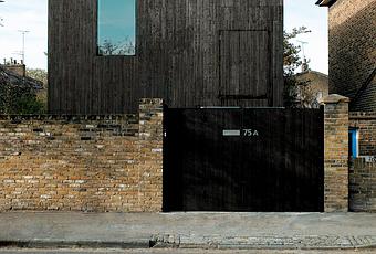 The facade achieves a notable sense of verticality for such a stout structure, with its stained-timber cladding aimed straight up toward the sky. The heavy, horizontal brick-work of the neighboring Georgian houses seems to imply aesthetic controversy, but