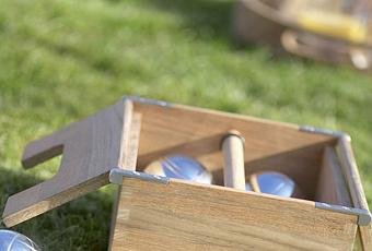 Having a lawn game at your party is a great way to keep guests entertained. A beautifully designed version of the classic lawn game, Pétanque—a French version of Italy's bocce—the Akiko Petanque set includes a set of six chrome boule balls and a target ball, packaged in a teak box for storing and carrying the game.