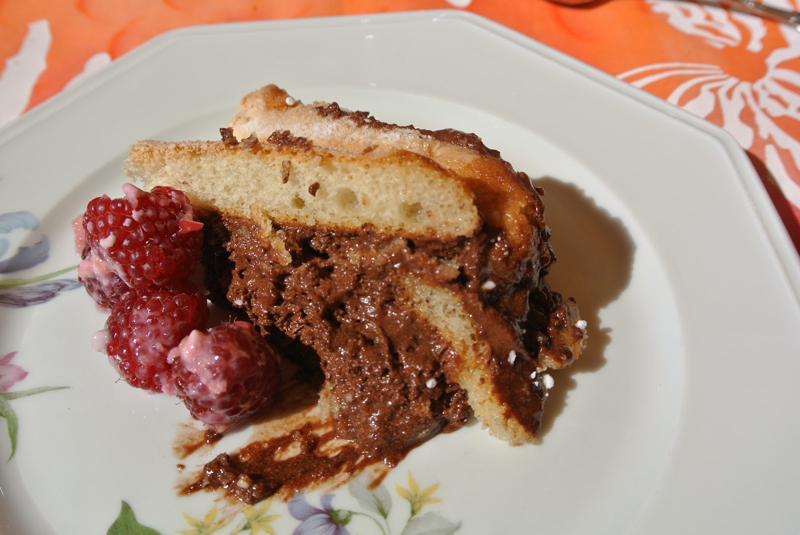 [dessert: sponge cake with chocolate mousse and raspberries]
