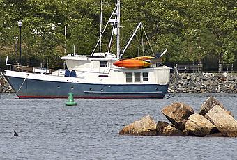 The boat's the focal point of the shot, and it's skewed to the left. The orange hull of the kayak (?) is more or less at the center and the bright orange contrasts effectively with the rest of the image. And then we have those rocks in the foreground and skewed to the right. They balance the shit.