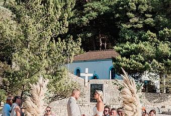 Dreaming of a destination wedding on a breathtaking Greek island? Look no further than the stunning shores of Ithaka, where Fern and David’s romantic celebration unfolded in the most magical way. Set against a backdrop of sparkling turquoise waters and lush green hills, their special day perfectly embodied boho and vintage elegance, with every detail beautifully curated by Ithaki Weddings. With Bosonis Flowers Events transforming the scene with impressive pampas grass, delicate pale pink roses and whimsical boho elements, a romantic atmosphere was created. As the ceremony literally took place next to the waves, Fern and David exchanged vows surrounded by nature’s pure beauty. Everywhere you looked, there was a new detail to fall in love with, making this destination wedding on the heart-stirring island of Ithaka truly unforgettable.
