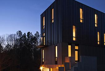 In Pittsboro, North Carolina, design-build firm Tonic contstructed a four-story, 3,200-square-foot residence for a musician and his son. By sing a philosophy of "construction-led design" to inform the structure's details, the firms was able to realize the design for $200 per square foot. Located on a 60-acre plot of land, the house features green elements like a small foorprint, bamboo flooring, Energy Star appliances, natural daylighting, an efficient HVAC system, and operable windows for cross ventilation.