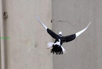 Pigeons are attractive ! - from distance they look black and strong gray. Variable in color, but most birds are bluish gray with two black bands on the wing and a black tip to the tail. There are pure white birds too – this one was different – half-white !! - a white pigeon symbolizes pure of heart