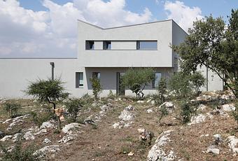 Architect Fabrizio FotiComposed of three “bodies” arranged to make a central courtyard, Casa M_P is an adaptation of the region's traditional villa architecture. The first body, the entrance, contains the kitchen and garage. The second body, the axis of the plan, contains the living room, gallery, library, and study areas. The third body contains the bedrooms and bathroom. As striking as the dwelling’s expansive white-gray planes is the arrangement of plexiglass tubing perforating the facade: it creates the illusion of a starry sky when viewed at night. This “reverse” lighting scheme—funnelling sunlight into the interior during the day and projecting interior lamplight onto the patio at night—creates a dazzling lighting scheme year round.