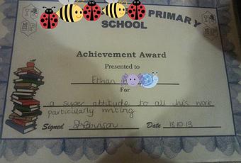 I was extremely proud of him when he walked out of school on Friday with a big grin on his face and a certificate in his hand that he had been given in Achievement Assembly, awarded for his super attitude, particularly when it comes to his writing.