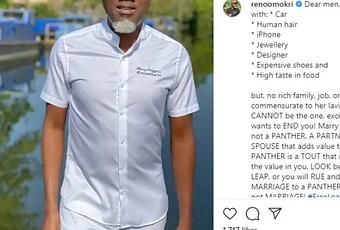 Reno Omokri in his nuggets to men said women who live a lavish lifestyle with no commensurate source of income, can’t be the one. He further advised men to marry a partner who adds value and not a partner who consumes value.