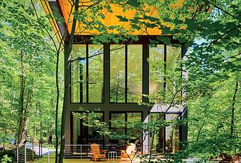 A cantilevered cabin designed by R D Gentzler blends into the forest, even as it hovers abovea 20-foot drop-off. Its south face is almost entirely glass, but a roof canopy limits solar gain. “We sit on the deck all afternoon watching the trees, and the time just flies by,” says resident Maricela Salas.
