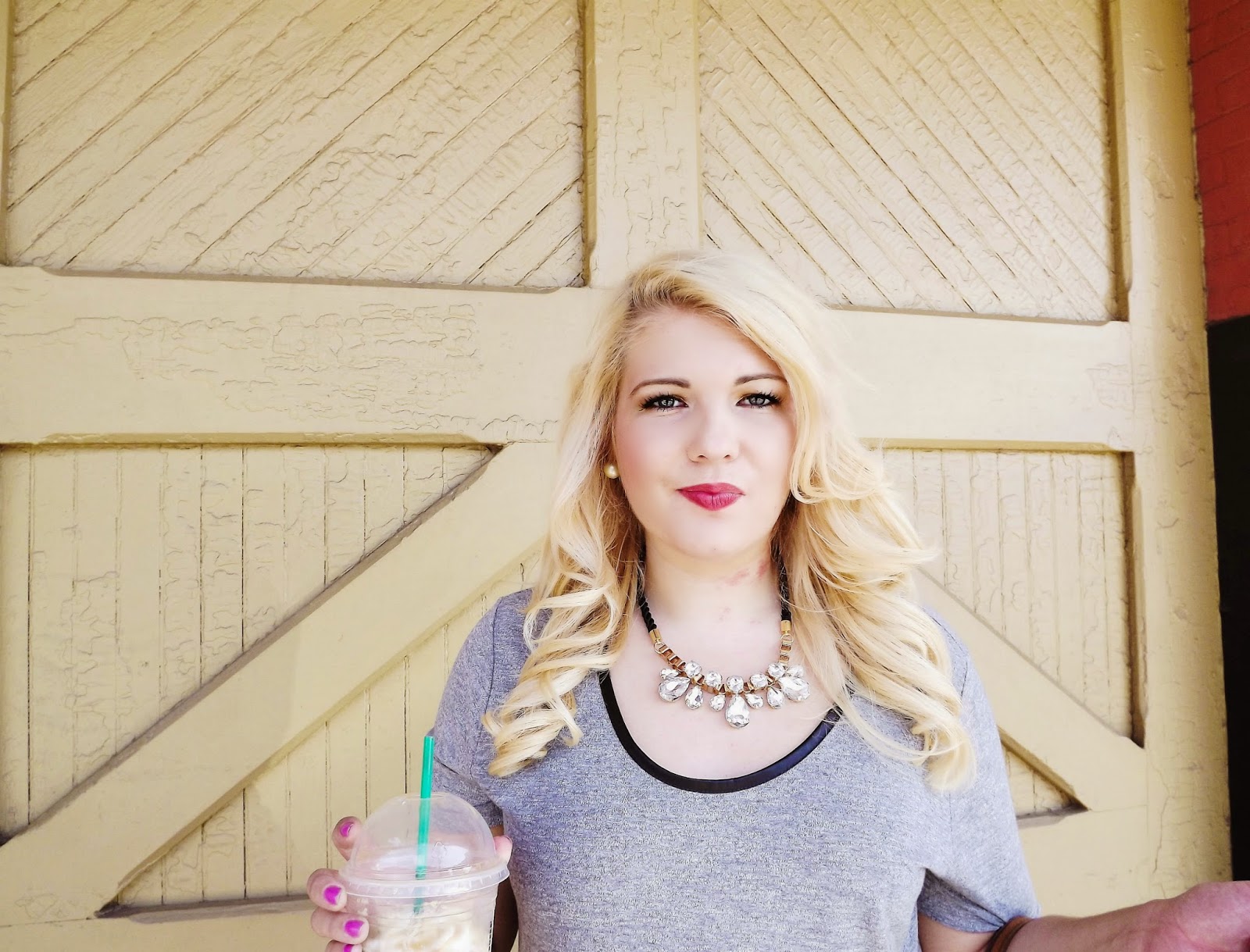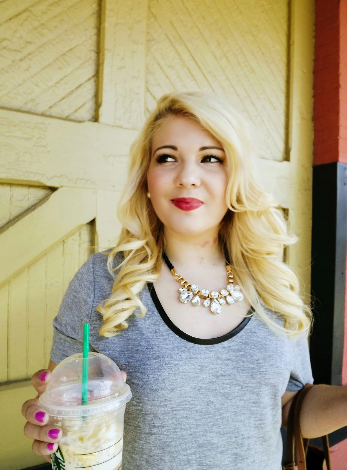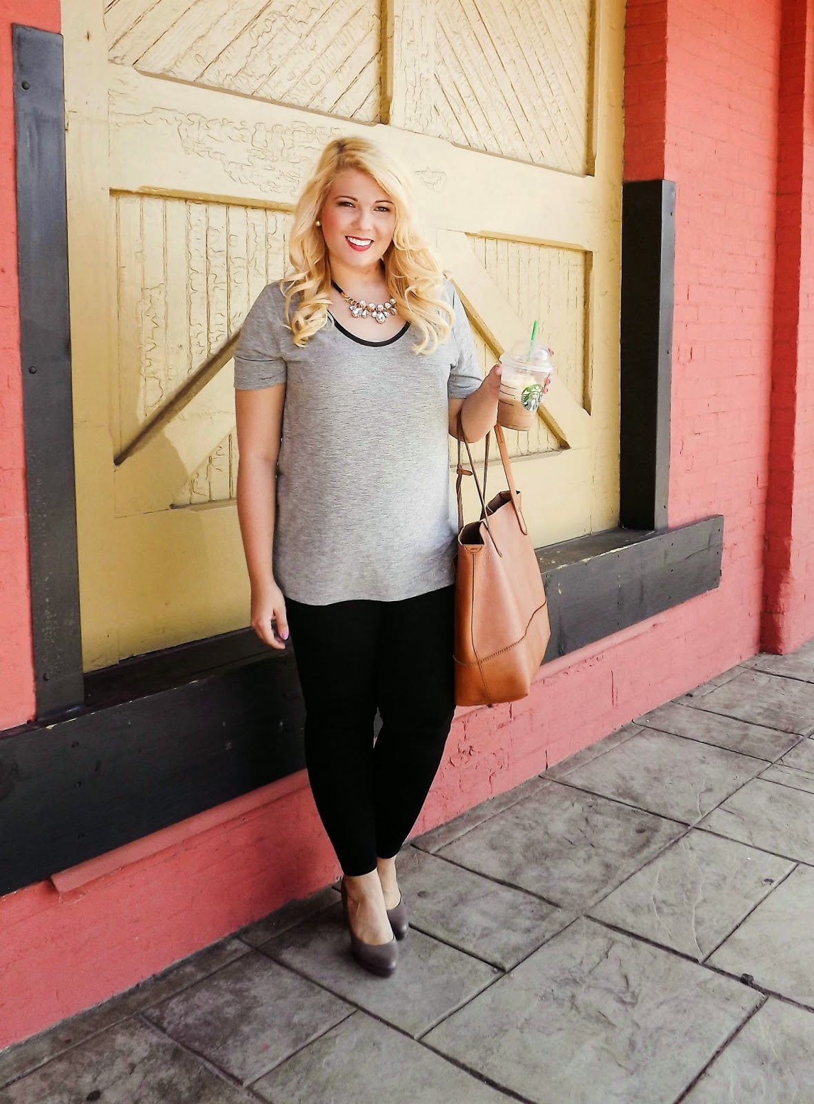 Outfit: T-shirt- Old Navy, Skinnies- Jennifer Lopez via Kohls, Necklace- Cato Fashions, Heels- Nine West, Purse- J. CrewA little leather detailing can make all the difference in a shirt. Continuing with my business wear series, this leather detailing makes the t-shirt work appropriate. As it goes, it's all in the details. The t-shirt looks more updated and gives you the extra emphasis while keeping the comfort factor. Of course because I had to look like the ultimate business chic white girl, I included my salted caramel frapp. The frapp was the first one I'd had in months! I usually go for the iced coffee so it was a little strange. If there's an outfit you'd like to see of have questions about business wear, please reach out! I'm loving doing these looks and sharing them with y'all! xoBCC