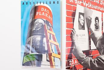 The sense of nested or hidden, underlying messages—indication of the designer’s authorial agency, despite working for a Socialist state—permeates the surrounding works on display. The age-old opposition between client and designer seems to have persisted even in Wittkugel’s lifetime, and in some cases, he seems to have been getting away with something. Among the meta works is 1954 Das Plakat (The Poster), a flyer for a poster exhibition that referentially depicts a poster column with a ladder propped upon it.