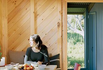 Architect Alex Scott Porter enjoys a sun-filled breakfast at the built-in dining table and bench, one of many space-saving designs she included in the seaside cabin she created for her father. Photo by: Eirik Johnson