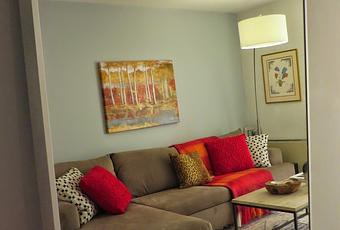 Had I had my druthers, I would have pushed to add temporary wallpaper to one of the living room walls in an effort to create a coordinated bold, graphic accent wall. I wanted to beef up the curtains as well but we were hesitant to put more holes in the walls, and I have not personally had any experience with the temporary wallpapers on the market. The idea is brilliant, but the reviews are mixed on the outcome and whether it actually peels off without a trace of adhesive. The landlord insured us we were on our own. Fear won out. I love the idea and it solves a real renter's dilemma when you want to put your own stamp on a place. If anyone has used it, I'd love to hear your thoughts and/or experience. It's not too late to add.