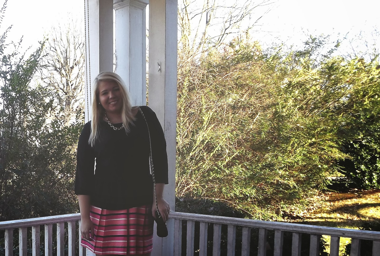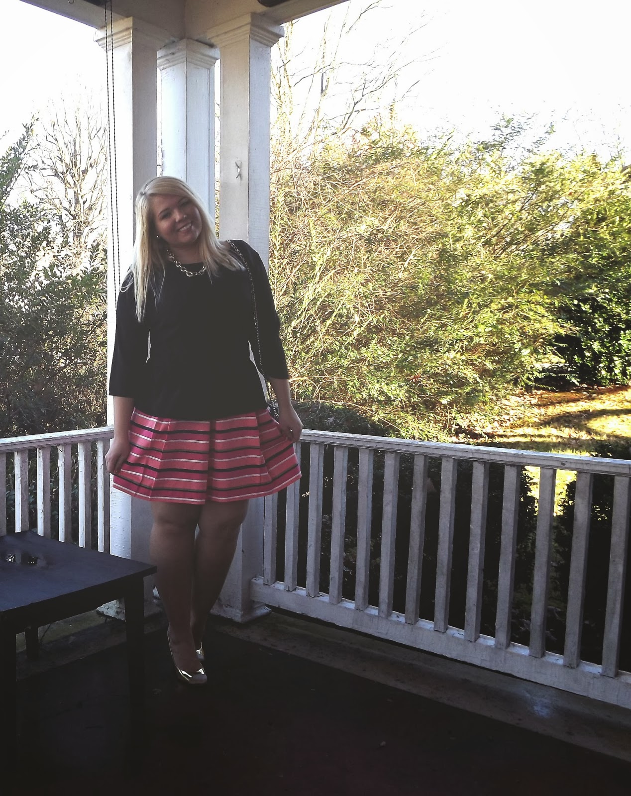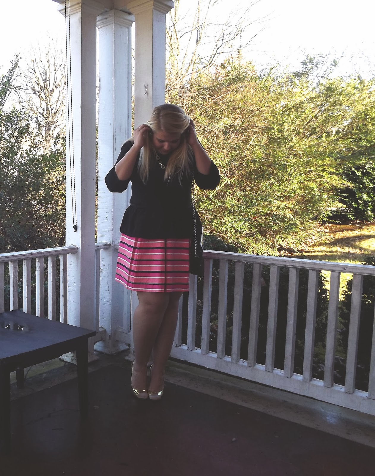 Outfit: Top- Target, Skirt- Gap, Heels- J. Crew, Purse- Boutique, Necklace- Coldwater Creek It's always fun to be able to combine a summery piece with a winter look. While this Gap skirt is clearly meant for summer, it works perfect in adding a statement to this New Year's Eve look. With the gold heels to offset it, the brightness of the skirt goes perfectly with the subdued black peplum top from Target.