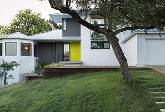 Architect Arbib Hughey DesignAfter their three kids had grown up and moved out, a retired couple decided that they were finally going to get the property they had always wanted. They had bought their family house in the 1980s for the surrounding neighborhood, a tree-filled enclave in Austin, Texas, with elevated views of the Hill Country, and accepted its uninspired architectural details. But, decades later, the home’s dark rooms and outdated features—as well as more pressing structural issues in the foundation and staircase—called for a long-awaited change. The couple’s son had worked with Arbib Hughey Design as an engineer, and he introduced his parents to principals Ben Arbib and Ed Hughey. “To be honest, the house was in rough shape,” Arbib said. “If the budget allowed, we probably would have torn it down.” Perhaps it was because of those monetary restrictions that the home received what it had always lacked: creativity. Cloistered rooms gave way to curved walls and an open floor plan, tired carpets were replaced with shiny oak, and narrow windows were widened for more natural light. And to make the modern transformation undeniably clear, the couple painted their front door a neon hue.