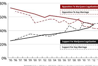 The chart above (from Talking Points Memo) is a combination of many polls since 1995. It should come as no surprise that since that time the support for same-sex marriage has grown (especially in the last decade) while opposition to it has now dramatically fallen -- and now the supporters outnumber those opposed by a significant margin in every poll. It may take a little bit longer, but the national legalization of same-sex marriage seems unstoppable.But what many people may not realize is that the legalization of marijuana has been on a very similar path in the polls to same-sex marriage approval. Both had less than 30% support back in 1995, and while same sex marriage is now approved of by a majority the support for marijuana legalization is currently approved of by an equal percentage to those opposing it. Clearly the momentum is on the side of legalization, and it would be very surprising if it wasn't approved by a majority in another two to three years (especially since two states have now legalized it).