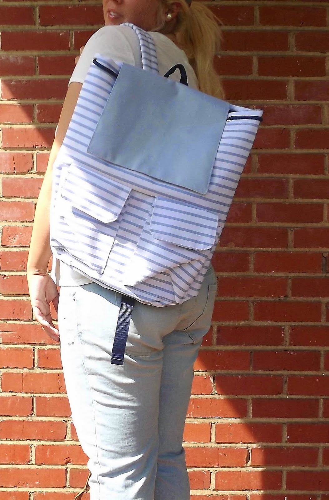 Outfit: Top- AEO, Boyfriend Jeans- Old Navy, Wedges- Target, Hat- J.Crew, Necklace- via Etsy, Rucksack- Shoplet PromosA few months ago, I was contacted by Shoplet Promos, to do a review on a product. The product I chose just looked like me, just a different version of me (since I had never found myself to be much of a "rucksack" kind of gal.) When the bag arrived, the package was lighter than expected. When I was younger, every backpack and rucksack I had was heavier than this. The bag is lightweight and fits a good deal more things in it than I had imagined. I filled it with my "lake" essentials and took it out to Ivy lake one day, towel and all, I even used it as a library bag to store my laptop and books on a day I did some summer class work. I think my favorite thing about the bag has to be the color. The light blue and white stripes are classic and that's one of my favorite color combinations (apart from green and gold.)