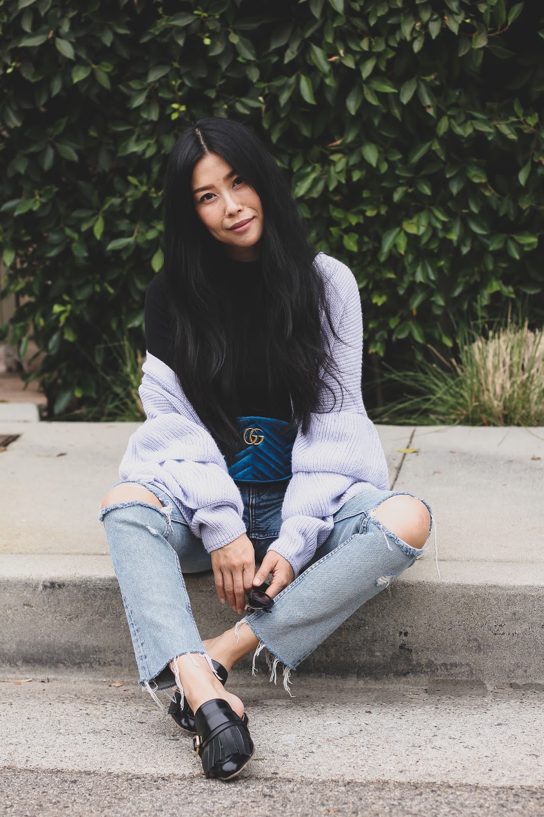 Kooding top | Reformation "Winona" jeans | Topshop via Nordstrom cardigan | Gucci "GG Marmont" belt bag | Marni mules | Kendall and Kylie "Sienna" sunnies