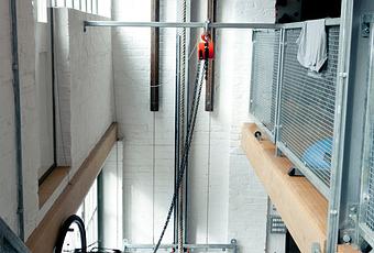 Brod Hart’s home in London’s Finsbury Park neighborhood is hidden away on a quiet street filled with the typical Victorian houses that populate the area. But behind the large steel doors that shield it from view stands what once began as stables, later served as a piano factory, and finally was converted to a wheelchair-accessible private residence. Hart managed the renovation himself and lived on-site during the process, which was challenging. His clever DIY skills and design tricks paid off: The end result is an industrial-chic modern house, fully accessible to wheelchair users. Brod designed the pulley himself, essentially a personal elevator, using nothing but cantilevered body weight to hoist him up and down within seconds. Photo by: Andrea Bakcas