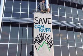 Three activists demanding an end to mountaintop removal block entrance to corporate office, stop business as usual.