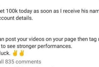 "A blind fan of mine who mimicked my voice. He'll get 100k today as soon as I receive his name and account details."