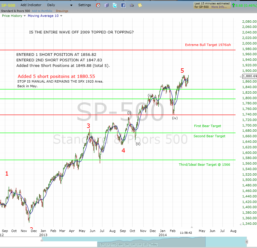 Stop remains that SPX 1920 area as was originally posted. Looking for a move down in April, and potentially a larger move down into June/July. I will be back to posting probably in May. Her eis the prior entry post. Prior Entry Post. I am still looking at this as a potential topping area. NYSE MASTER COUNT. We still have that IWM channel right in this area. IWM TOP CALL UPDATE. If I am wrong, here is the Exterme Bull Count. Binary Moment. I am watching this indicator setup form yesterday. Yesterday's Indicator Analysis. This has potential to be a significant correction longer term, which is why I am playing it longer term. Recent Long Term Update.