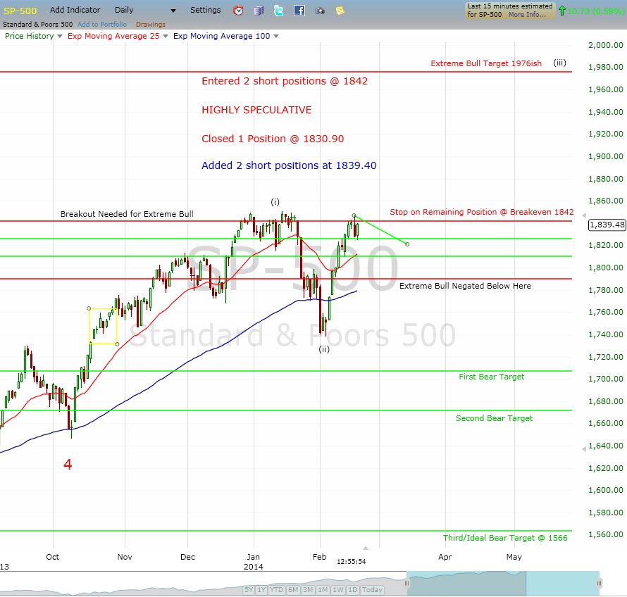 The 1825 support discussed yesterday held. We are not ST bearish unless we break below. We are, however, testing resistance. I think it likely breaks to the upside. However, what I think does not really matter. The stop is a couple SPX points so I am spec'ing it to the short side....