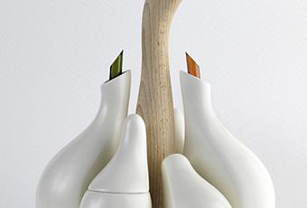 Functional and sculptural, the AJORI Condiment & Seasonings Tray is a unique design. Inspired by the way a garlic peels, the different textures and shapes of the cloves; this piece of art organises and holds six small containers for various dressings and creative culinary endeavours. Similarly, the natural materials of mud and wood enhance the clean lines of this simple yet clever design. Winning first prize at the Castilla-La Mancha Applied Design Awards in 2011, this cruet is distinctively Spanish.
