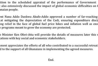 “Government appreciates the efforts of all who contributed to a successful retreat and looks forward to the support of all Ghanaians in implementing the agreed measures.”