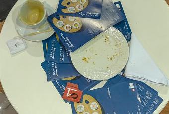 The event began with both Esther and Sohan working individually on their pieces of art. Where Esther kept brewing one cup of coffee after another with different designs, Sohan started imprinting the coffee paste using a wooden block on a canvas.