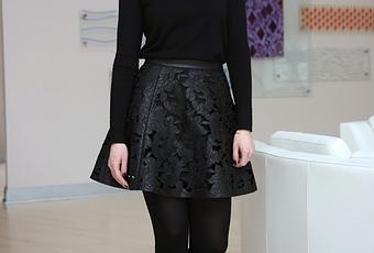 Varying textures like knit, leather, and suede, within one outfit, gives dimension to an otherwise potentially boring outfit. Take for instance my leather skirt. It's black obviously, but both the sheen from the leather and the laser cut flowers give it depth and give the eye something else to look to, aside from a blob of black. Also, the gold hardware on both the exposed zippers of my boots and skirt (no pictured) is an interesting detail that again, draws the attention of one's eyes. So yes, black may be synonymous with the darker side of life, but when done right, there's nothing chicer!