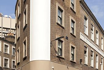 Formerly an office building with a dark basement, the structure—reminiscent of the Flatiron building in New York—was updated with a curved window on the street level, as well as a perforated white acrylic panel that allows light to enter the house.