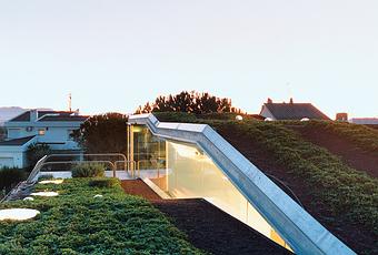 An angular hydroponic rooftop garden gently tops this suburban sustainable home in Liers, Spain.