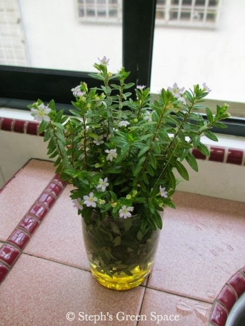 The Mexican Heather (Cuphea hyssopifolia) was the first to get a cut back. The shrub grew a little crazy this time round. Though it bloomed a little more than usual, I have to prune it as the stems have gotten leggy. Anyway, after pruning, I grabbed a bunch of the stem cuttings and placed them all in water, making my kitchen pretty for a few days :-)