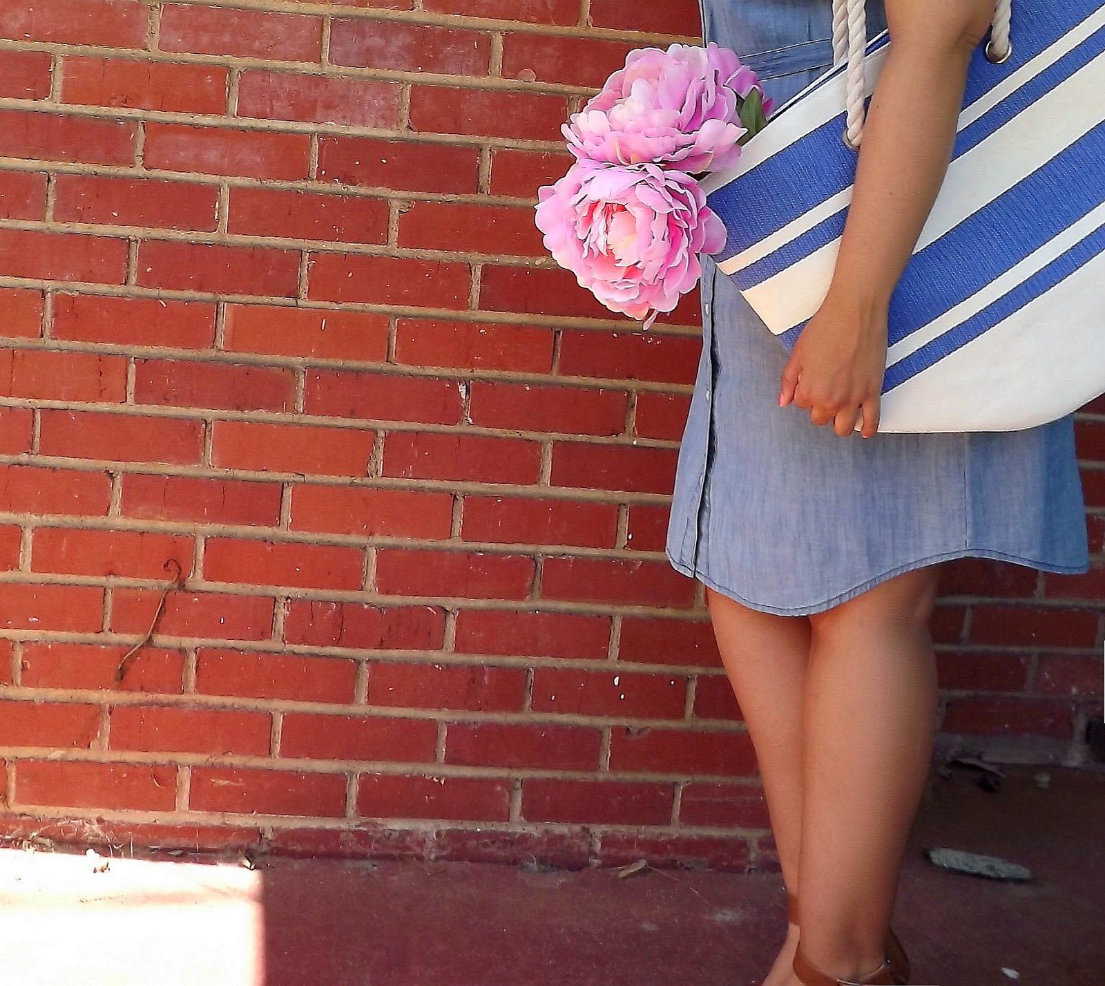 Outfit: Dress- Old Navy, Necklace- The Farm Basket, Sandals- Cato Fashions, Tote- Joules...As simple as can be. Elegant and free. American Honey...Growing up in a small town; I've witnessed the hunting camo, the denim, and other trends that should forever be kept under raps and out of the lime light. This look provides the perfect way to wear the chambray without looking too small town. Going back to my roots, the chambray helps to stay cool on a warmer day and doesn't cling to the body in the humidity. In the Virginia summers, the humidity kills and it's necessary to find styles and materials that won't overwhelm you during the season. I love the simple shape of this chambray dress from Old Navy. The dress is comfortable and light, making it wearable in this 90 degree weather. Paired with the right shoes, it gives off less of a mom vibe, and more of a 20 something year old one. The ankle strap sandals have a slight wedge which give a little extra lift to the calf, making the look more desirable. Y'all of course know how obsessed I am with the chunky necklaces, so given the fact that this was also a gorgeous oversized tortoise shell chain one, I was one happy camper! Paired with red gloss and the Joules tote, THIS is my "hey there summer" ensemble! (Let's be honest, we are all a little taken aback that summer is already here!)xoBCC