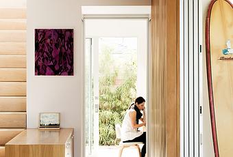 Stairs lead to a wide central corridor, around which the master bedroom and two children’s rooms are arranged; at either end, a full-frame picture window faces the backyard and a sliding glass panel that leads to a large outdoor terrace out front. “We wanted the upstairs > deck to be larger than a balcony so that we would spend a lot of time up there,” Tracy says, in a keen observation of how people use outdoor space, or, more specifically, how they don’t use balconies. Thaddeus adds, “We can be with friends up on the deck where there’s privacy but we can also see the kids playing in the side area.”