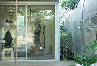 Nestled within a citrus orchard, Keren Milchberg Porat and Shai Porat’s home combines a rehabbed Airstream and single-room structure into a cohesive whole. The playroom is positioned as close as possible to the trailer without blocking its light and view and is clad in similar galvanized steel sheeting. Australian acacia and ficus trees planted in the void suggest a vegetal stitching-together of the disparate structural elements.